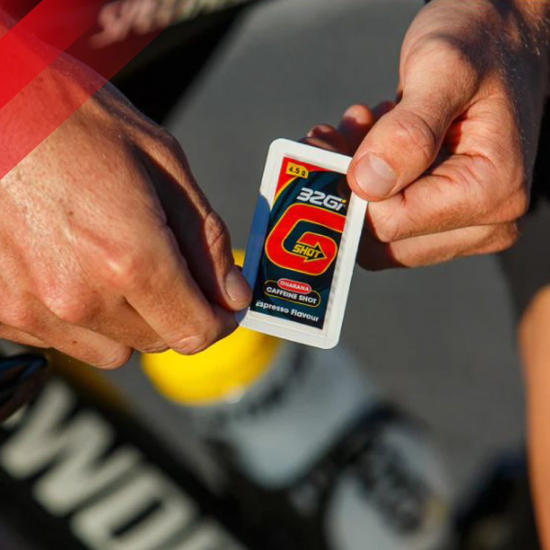 32Gi®’s Race Range G-Shot is a unique small and easy to carry caffeine shot dispensed in a gel format. The G-Shot uses pure Guarana to immediately deliver 60 mg of caffeine when consumed. It is low calorie with very little carbohydrates, allowing for caffeine intake to be accurately measured without upsetting the balance of carbohydrate intake.